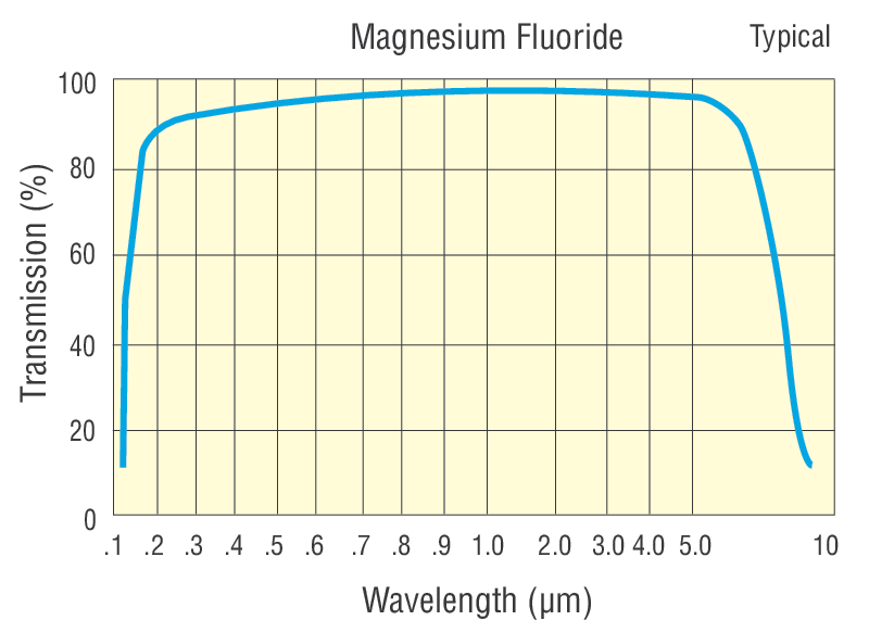Newport's Magnesium Fluoride Optical Windows are transparent over a very wide 120 nm to 8 µm spectral range. Magnesium Fluoride is durable, resistant to both thermal and mechanical shock, and has a high laser damage threshold.