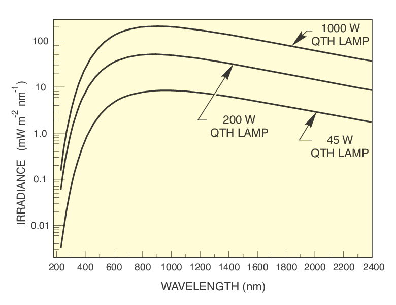 QTH lamps of 45 W, 200 W, and 1000 W input power are available as standalone lamps or complete light source kits for turnkey operation. The 45 W QTH lamp option outputs light from 300 to 2400 nm. The 200 W and 1000 W QTH lamp options output light from 250 to 2500 nm. A lamp should be chosen based on the wavelength and irradiance requirements of the application or system. Output irradiance of the lamp must be intense enough to produce a good signal to noise ratio without saturating a photodetector or other components in the system.