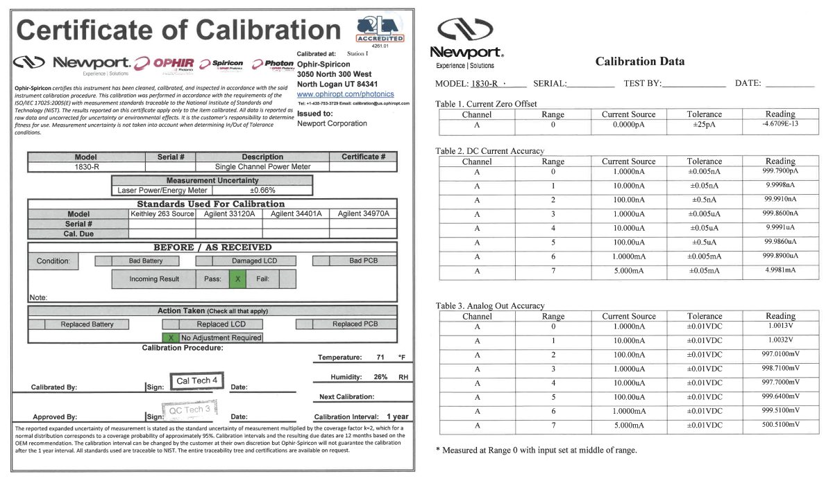Newport certifies calibration performed using standards traceable to the National Institute of Standards and Technology (NIST) and other recognized national standards laboratories. Included with your new instrument is a comprehensive calibration report. Newport also recommends recalibration every 12 months.
