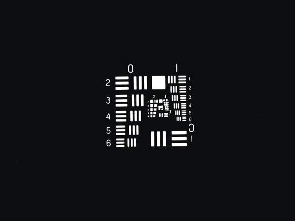 Resolution test targets are designed to quantitatively test optical system performance as well as provide length calibration for microscopy. These targets consist of groups of line-space patterns whose spatial frequency increases as the sixth root of two.
