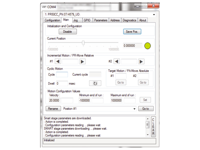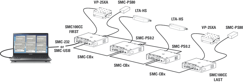 The SMC Motion Controllers are single axis motion controllers/drivers for DC servo motors (SMC100CC) and 2-phase stepper motors (SMC100PP) up to 48 VDC at 1.5 A rms. Both controller types can be daisy-chained in a communication bus with up to 31 devices. SMC controllers can also power daisy-chained depending on attached positioner. Communication interface to a computer or a programmable logic control is available through an RS232 interface with ASCII commands.