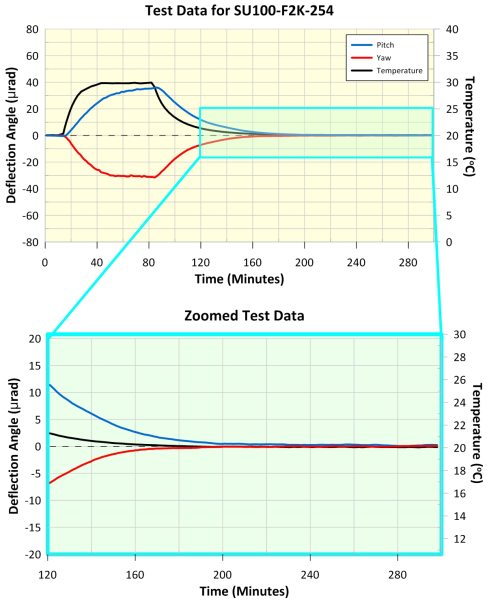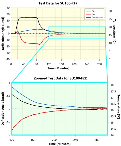The maximum deflection of the SU100-F2K mirror mount during peak temperature was 7 µrad in pitch and 17 µrad in yaw, and the shift in reflected beam position after temperature cycling was < 1 µrad in pitch and < 1 µrad in yaw. This demonstrates the mount's excellent thermal properties. Further details are shown in the accompanying graphs.