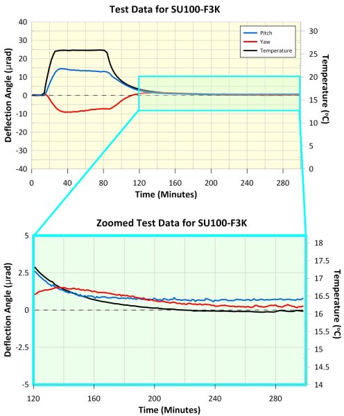 The maximum deflection of the SU100-F3K mirror mount during peak temperature was 15 µrad in pitch and 10 µrad in yaw, and the shift in reflected beam position after temperature cycling was < 1 µrad in pitch and < 1 µrad in yaw. This demonstrates the mount's excellent thermal properties. Further details are shown in the accompanying graphs.