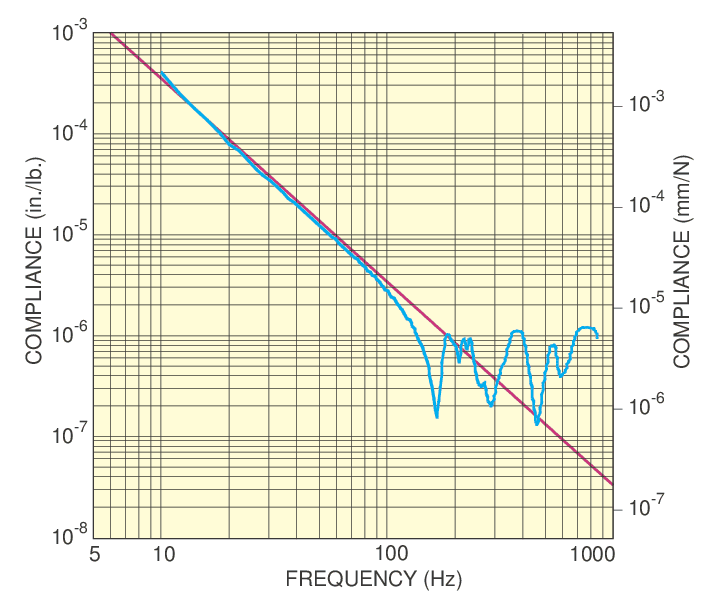 The compliance curve shows the positional motion of the structure for a given excitation force and frequency. The red line is the rigid body line showing how an ideal optical table would perform with no relative motion. The blue line shows the natural frequencies of the optical table and how they deviate from that of a rigid body.