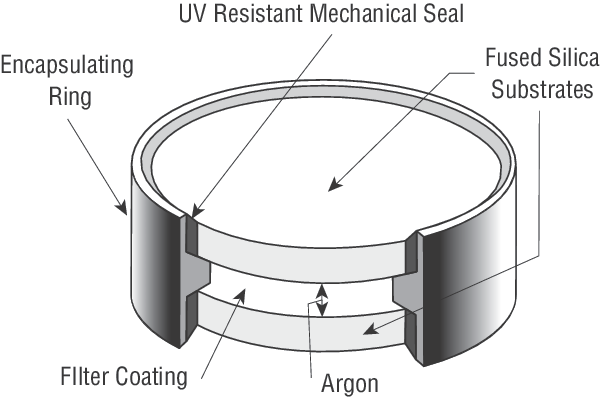 Our UV band-pass filters in the 214 nm to 300 nm range are fabricated using our Argon-Gap Technology. These filters demonstrate superior spectral stability and field lifetime in demanding applications such as water purification and environmental monitoring. Argon-Gap technology employs a proprietary sealing process that eliminates sources of solarization by-products, such as epoxy sealants. Solarization by-products, which are created by the chemical breakdown of organic materials resulting from exposure to ultraviolet light, are a principal cause of premature failure of short-UV filters.
