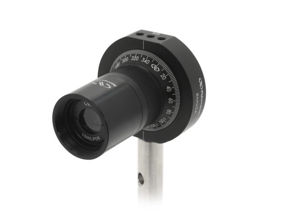 Wollaston prisms are fabricated from select-grade calcite right angle prism pairs, cemented together to form a cubical optic. The cemented prism pair is assembled into a 25.4 mm diameter black anodized aluminum housing with a 10 mm clear aperture. One of the housing's faces features a slotted indentation to aid with assembly, while the other face is white marked to indicate the optical plane within which the S- and P-polarized beams separate.