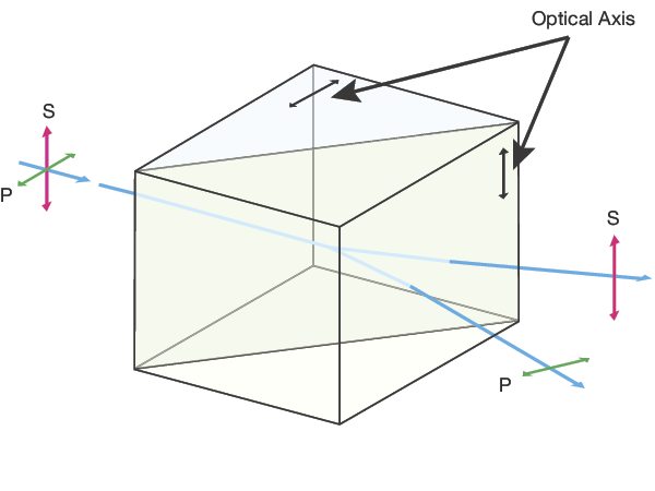 The optical axes of each prism in the pair are simultaneously perpendicular to one another and perpendicular to the propagating beam. This results in crystal axis orientation suddenly changing at the interface between the two prisms. The beam component that is S-polarized (relative to the prism hypotenuse) will experience a decrease in refractive index equal to the difference between ordinary and extraordinary refractive indices for Calcite. Light that is P-polarized will experience an equal but opposite change, or an increase of the index from the extraordinary index to the ordinary index. Thus, S- and P- polarized components of the incoming beam will diffract into opposite directions. The final output beams will exit the back port of the polarizer housing with a nominal separation angle of 20 degrees.
